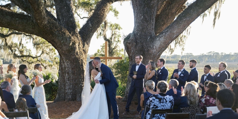 Wedding Design: Sawdust and Sweetgrass Rentals | Florals: Charleston Flower Girl | Photography: N. Mickle Photography | Venue + Bar + Catering: Wiki Wiki Sandbar | Rentals: Adorn Charleston + Sawdust and Sweetgrass Rentals | Linens: EventHaus Rentals | Cake: The Cake Stand | Graphics + Signage: cu bo llc | Bride’s Attire: ModelBride + DNa Lab | Bridesmaids’ Attire: Bella Bridesmaids | Beauty: DNa Lab | Men’s Attire: FE Design Studio | Getaway Car: Lowcountry Valet & Shuttle Co.