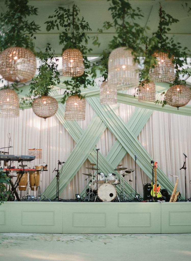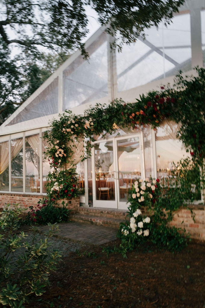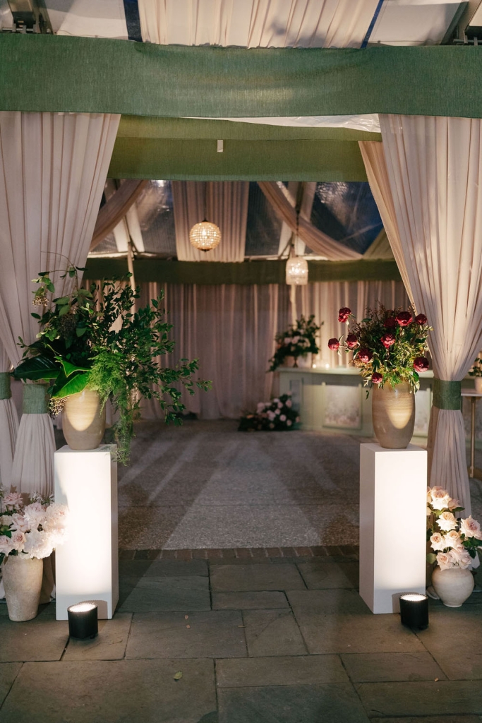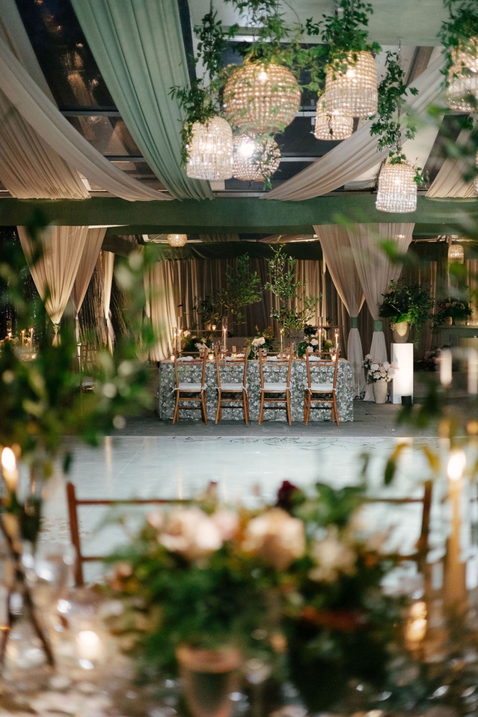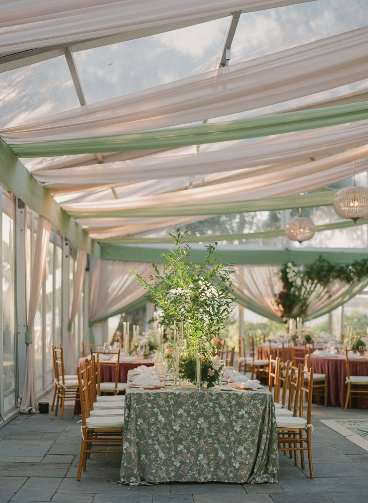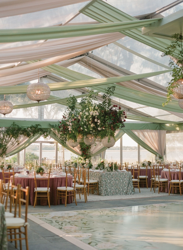 For Phoebe Frank and Colter Phillips’s garden-inspired celebration, the Social Spoolers utilized almost 1,300 yards of sage and ecru sheers woven in a crisscross pattern to add dimension and lend a feeling of timeless romance to the space. They finished the look with textural valances and drapery cuffs. While lots of draping is intended to cleverly cover the industrial aspects of a venue (think tent poles, electrical outlets, and cords), carefully designed layouts can also add to the beauty of a venue. At this late November reception, lush, overlapping curtains perfectly framed the wintery marsh views through the tent’s waterfront entrance beside the Ashley River.