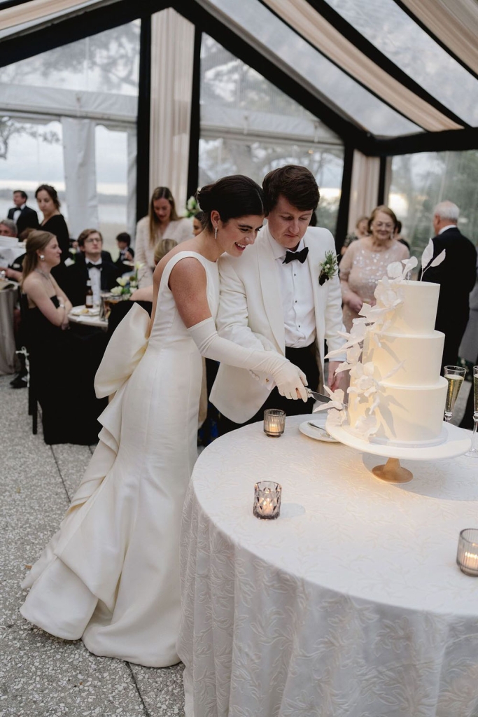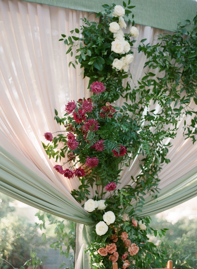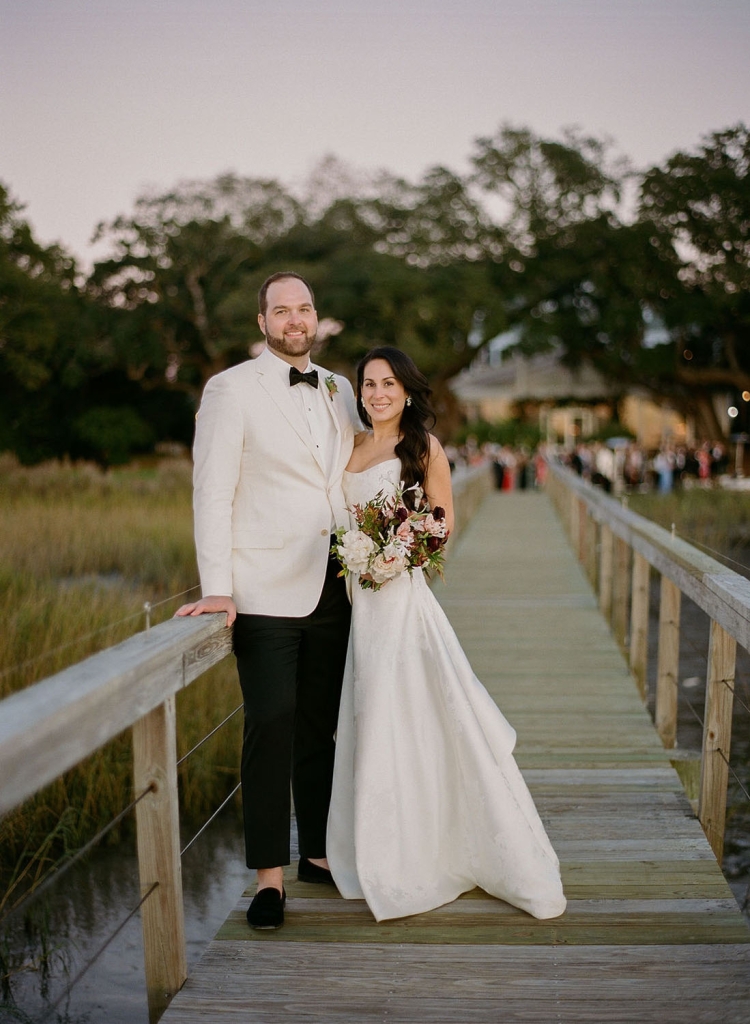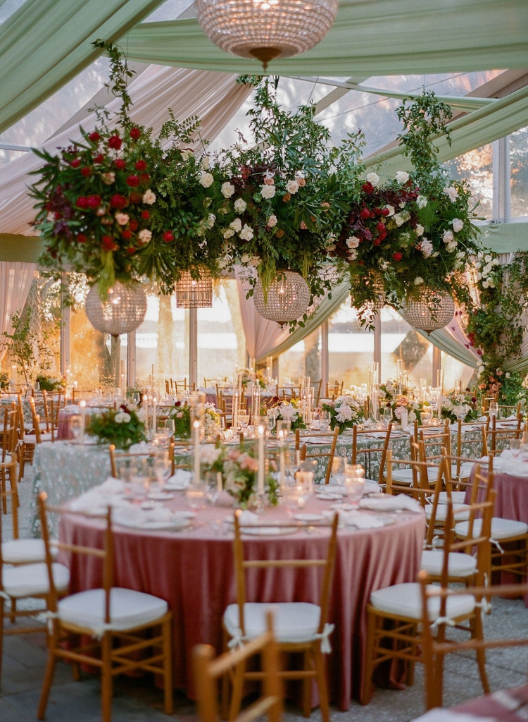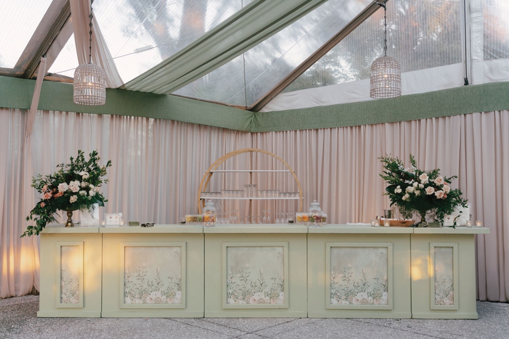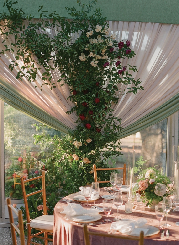 For Phoebe Frank and Colter Phillips’s garden-inspired celebration, the Social Spoolers utilized almost 1,300 yards of sage and ecru sheers woven in a crisscross pattern to add dimension and lend a feeling of timeless romance to the space. They finished the look with textural valances and drapery cuffs. While lots of draping is intended to cleverly cover the industrial aspects of a venue (think tent poles, electrical outlets, and cords), carefully designed layouts can also add to the beauty of a venue. At this late November reception, lush, overlapping curtains perfectly framed the wintery marsh views through the tent’s waterfront entrance beside the Ashley River.