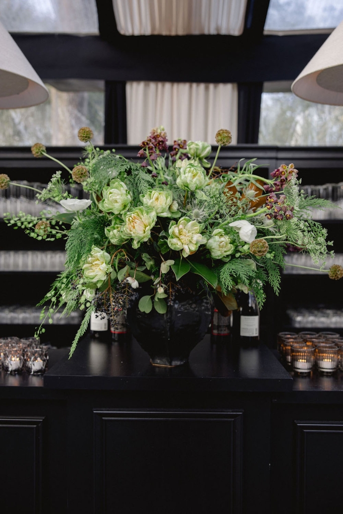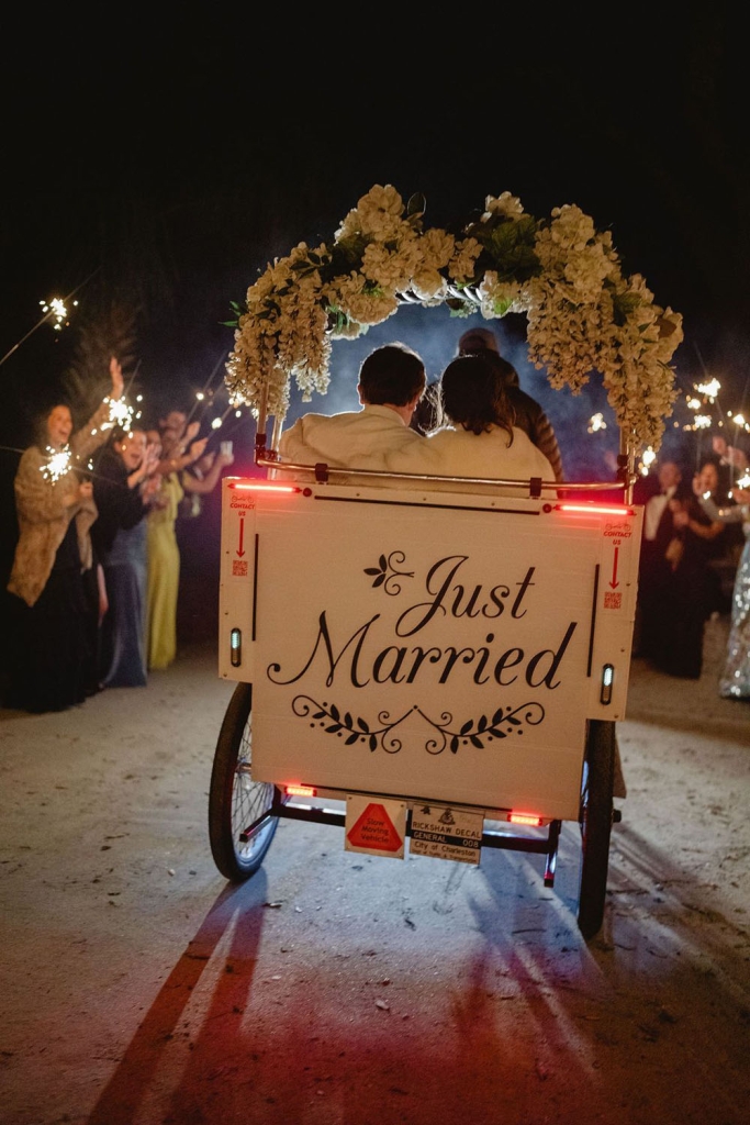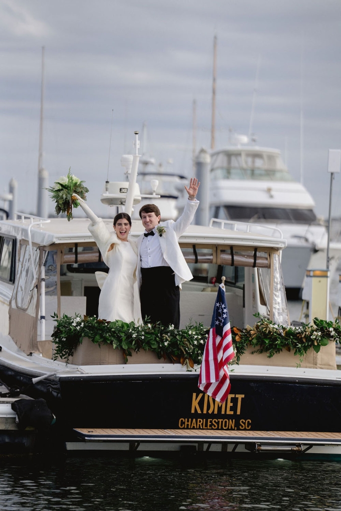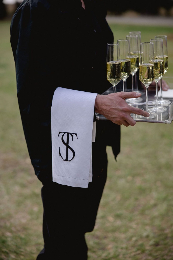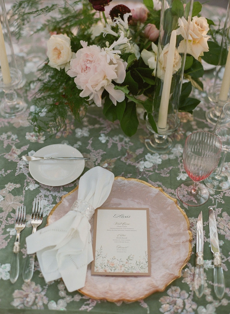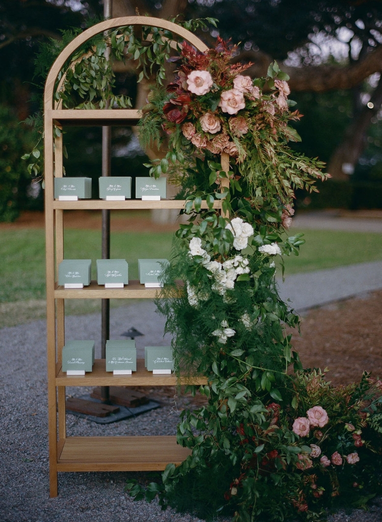For Phoebe Frank and Colter Phillips’s garden-inspired celebration, the Social Spoolers utilized almost 1,300 yards of sage and ecru sheers woven in a crisscross pattern to add dimension and lend a feeling of timeless romance to the space. They finished the look with textural valances and drapery cuffs. While lots of draping is intended to cleverly cover the industrial aspects of a venue (think tent poles, electrical outlets, and cords), carefully designed layouts can also add to the beauty of a venue. At this late November reception, lush, overlapping curtains perfectly framed the wintery marsh views through the tent’s waterfront entrance beside the Ashley River.