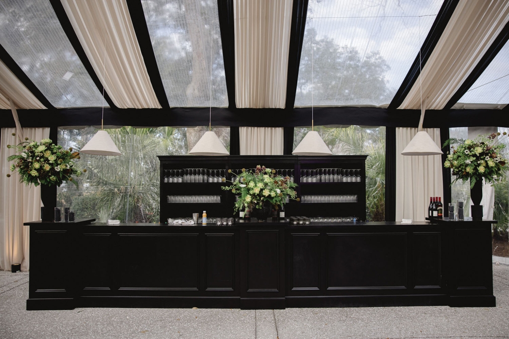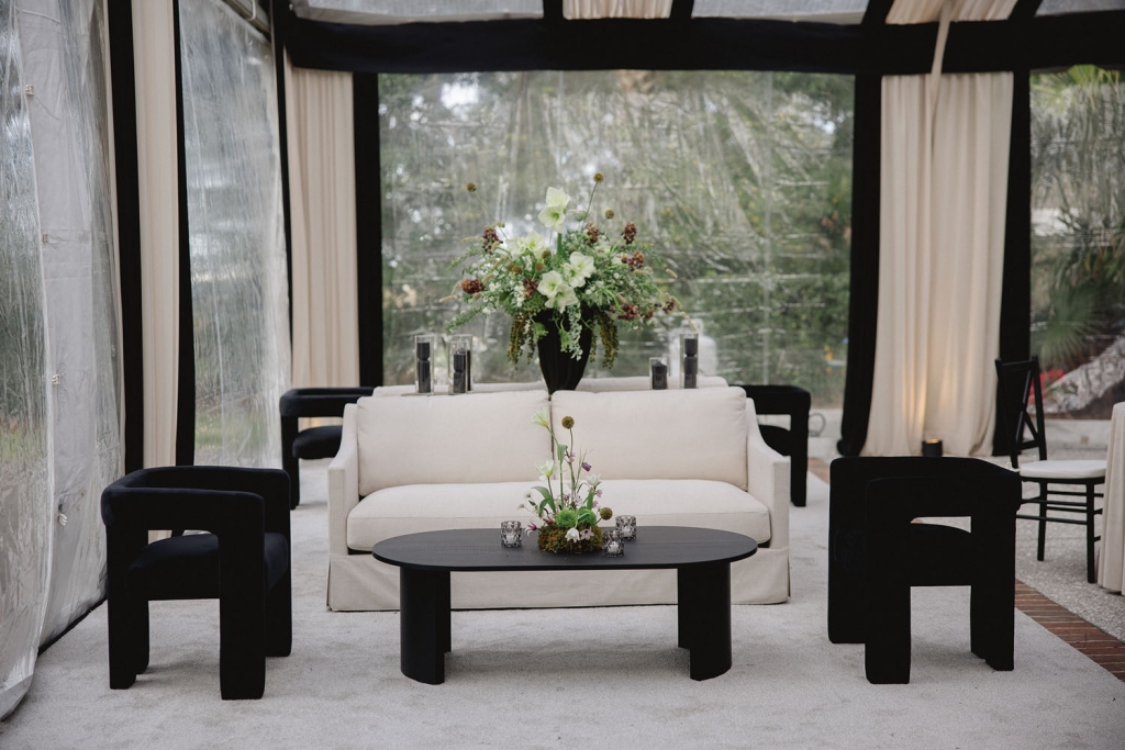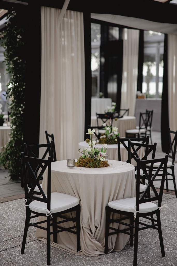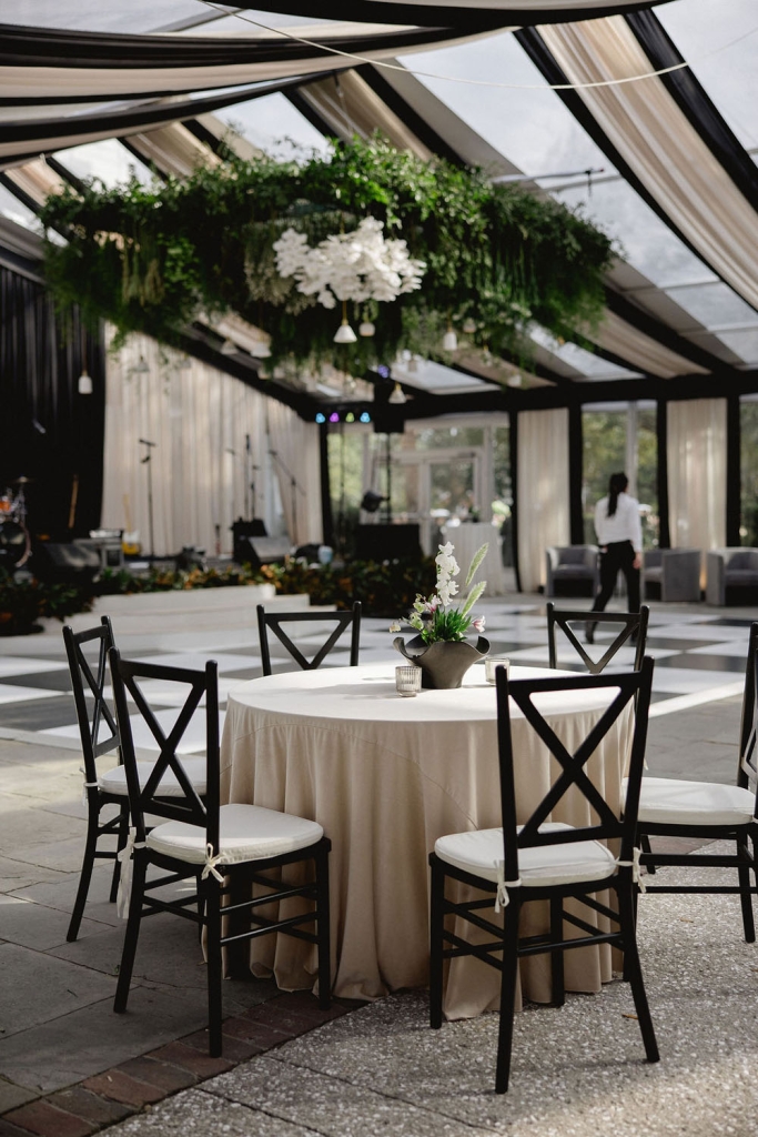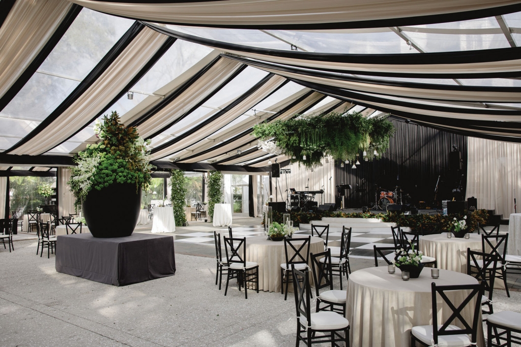 In contrast to that organic vibe, Sara Scruggs and Troy Woodward chose a sleek and formal aesthetic for their Lowndes Grove reception just a few months later. The bride wanted “a modern take on classic,” so the Spool crew hung bold, contrasting neutrals in tight bands along the tent frame to create a clean, elevated feeling. They used the same ecru sheers here but lined them with black satin and woven valances to achieve a streamlined appearance.