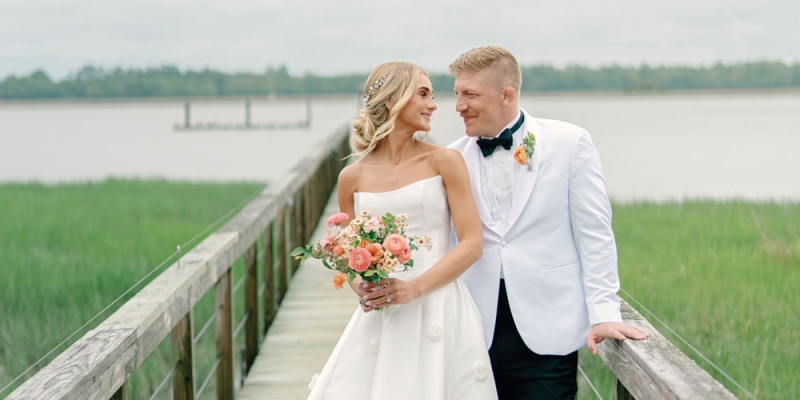When Emily Mullins laid eyes on fellow Virginia Tech student Pepe Diaz-Llaneza at The Rivermill bar in Blacksburg, Virginia, in 2001, she had a “he’s the one” moment. Almost seven years later, the pair were vacationing at the Charleston Harbor Resort and Marina when Pepe asked Emily to take a walk with him. It raised a major red flag with her because it was a hot and humid day, and “He’s not a fan of heat,” she laughs. As the pair strolled down the pier, Emily remained suspicious until Pepe dropped to one knee and delivered his proposal. With her “Yes!” hanging in the air, onlookers applauded and friends joined them, champagne in hand.