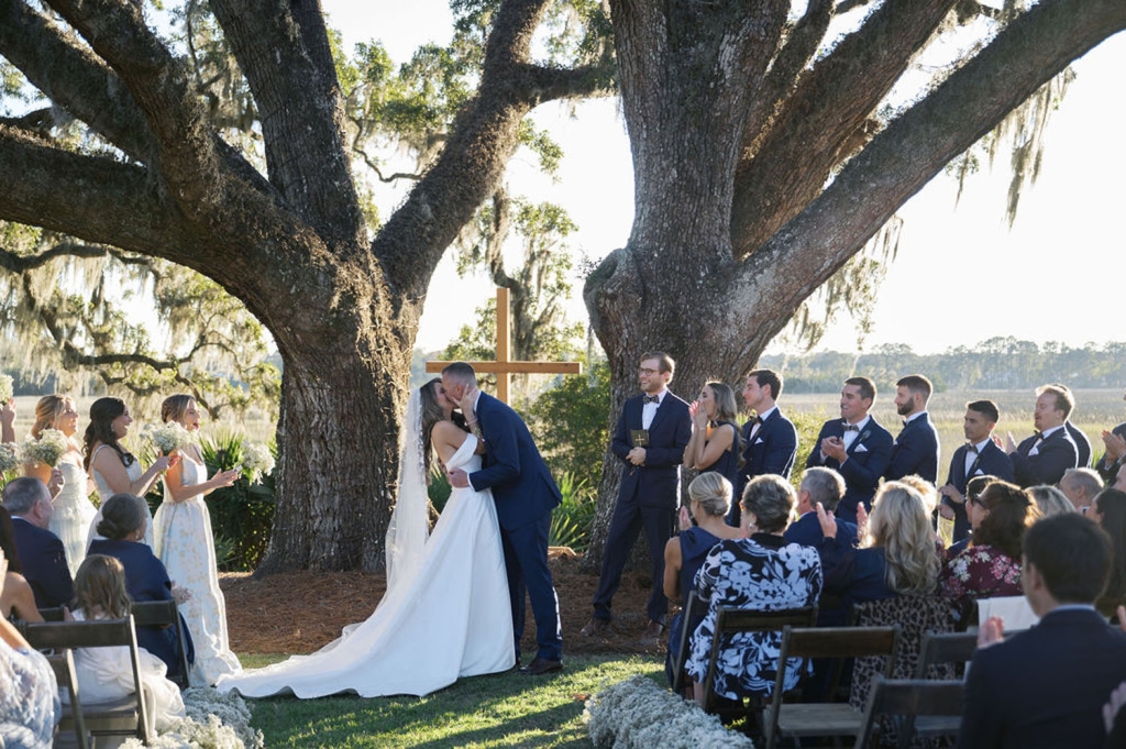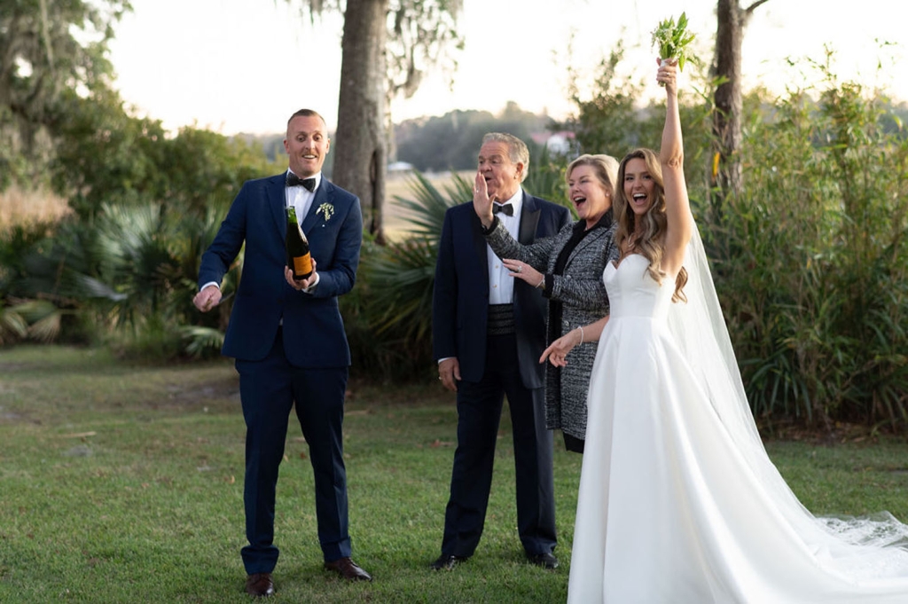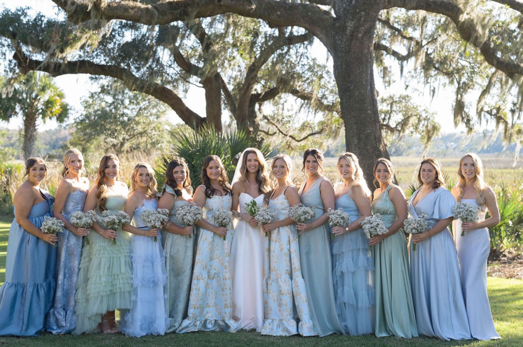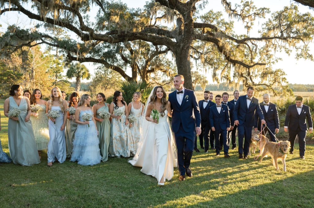 Having grown up in Darlington, South Carolina, Dantzler had always envisioned a grand Lowcountry wedding. So when her aunt and uncle suggested their historic John’s Island estate as a venue, the idea felt like a dream come true. With most guests traveling, the couple planned a celebration showcasing the best of the Lowcountry, from a marsh-front ceremony to boiled peanuts at cocktail hour and a shrimp and grits dinner. The bride and groom were also touched to have a large wedding party beside them (the ladies in an array of dresses), including a dear friend who stood as best man in honor of her late brother.